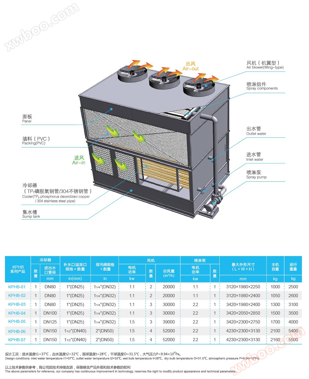 闭式冷却塔从工艺设备里流出来的高温度介质,经过冷却塔的循环泵加压输送到闭式冷却塔的冷却盘管当中,并且在盘管当中流动。利用水泵将闭式冷却塔水箱当中的加压抽到喷淋装置当中,均匀的喷洒在冷凝盘管的外表面上,冷凝盘管表层的水迅速的吸收冷凝盘管传递出来的热量,汽化蒸发,降低喷管内冷却介质的温度。在冷却塔的顶部设计了风机,风机快速转动,带动他体内部的气流流动,加快了热量的散发。为了防止大量的水分子流动而造成冷却塔耗水严重,转么设计了收水器,收水器可以将蒸发的水汽再液化滴到底部的水池当中。