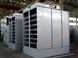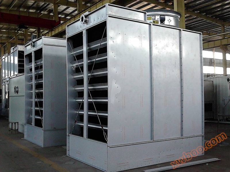 外壳是采用了镀铝锌板材制作,采用了的折板、傅边工艺,版块拼接添加黑色密封胶进行密封,保证水不会渗出。顶部设计了两个风机,风机的叶片材质为尼龙材质,采用了国外进口电机和轴承,并且每个风机配置风叶一副,电机轴承润滑油一桶。底座采用了槽钢进行支撑,内置冷凝器为T2紫铜管,铜管排列为20排,弯头焊接。内部散热材料采用了冷却塔填料+铜管冷凝器双重散热装置,可保证相同流量具有更好的散热效率。